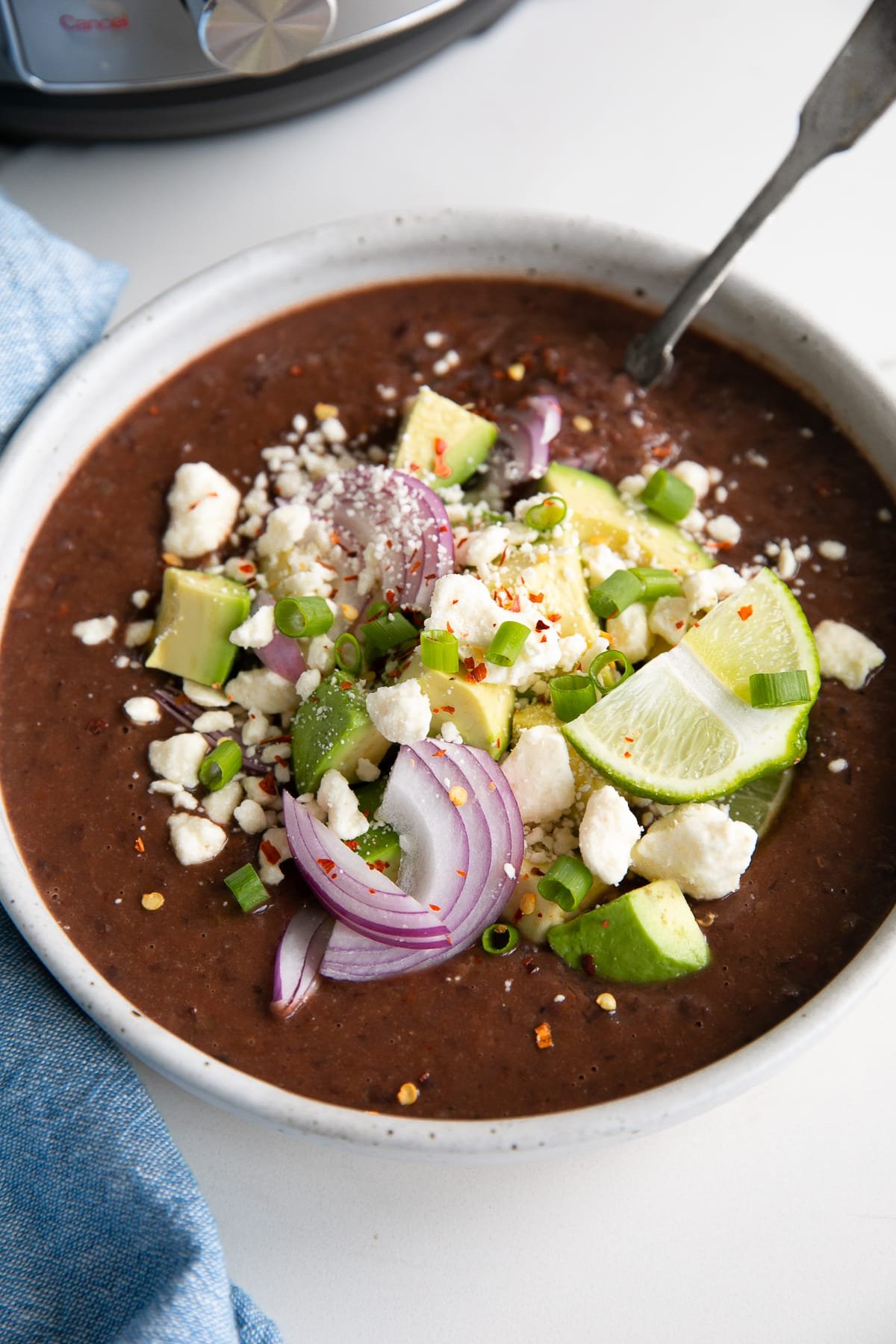 Inspired by a favorite restaurant soup, this hearty, comforting Instant Pot Black Bean Soup tastes like it’s simmered for hours. But the layers of rich flavor develop quickly and easily in your pressure cooker!