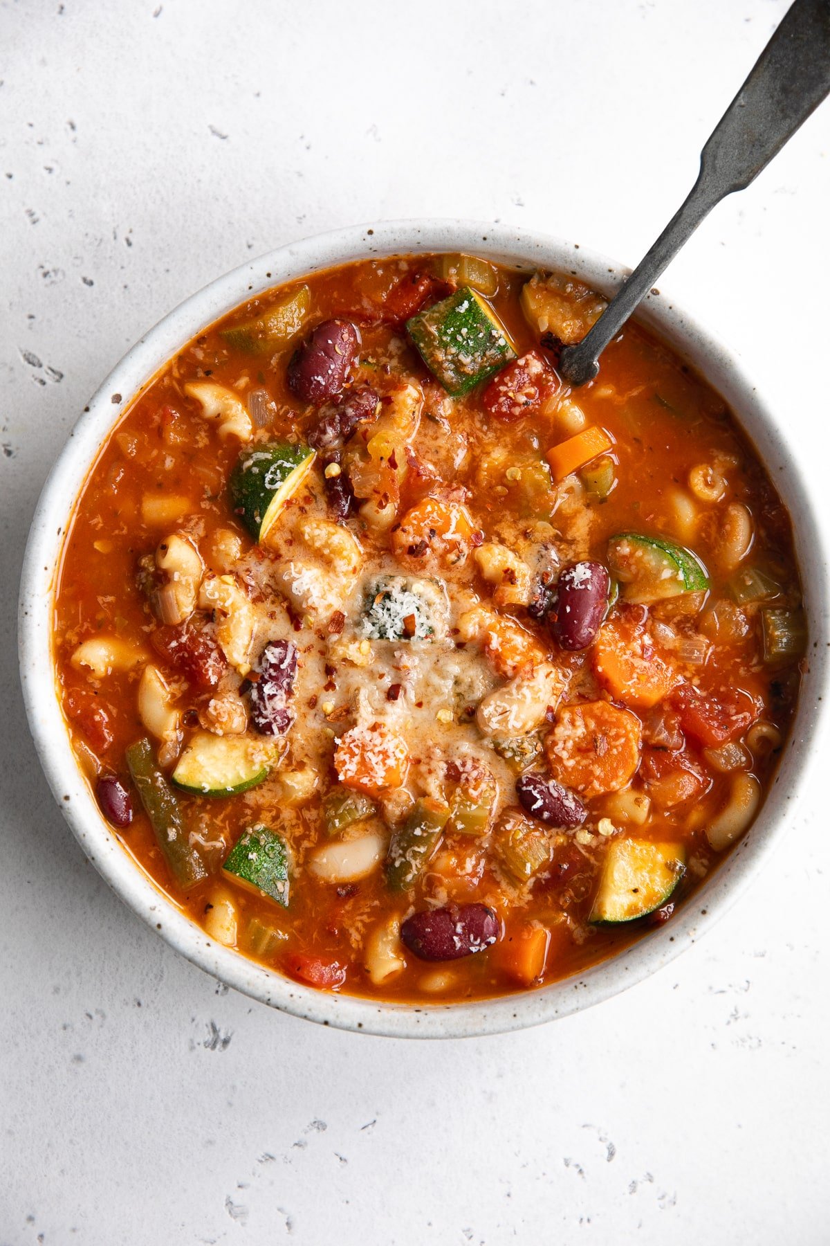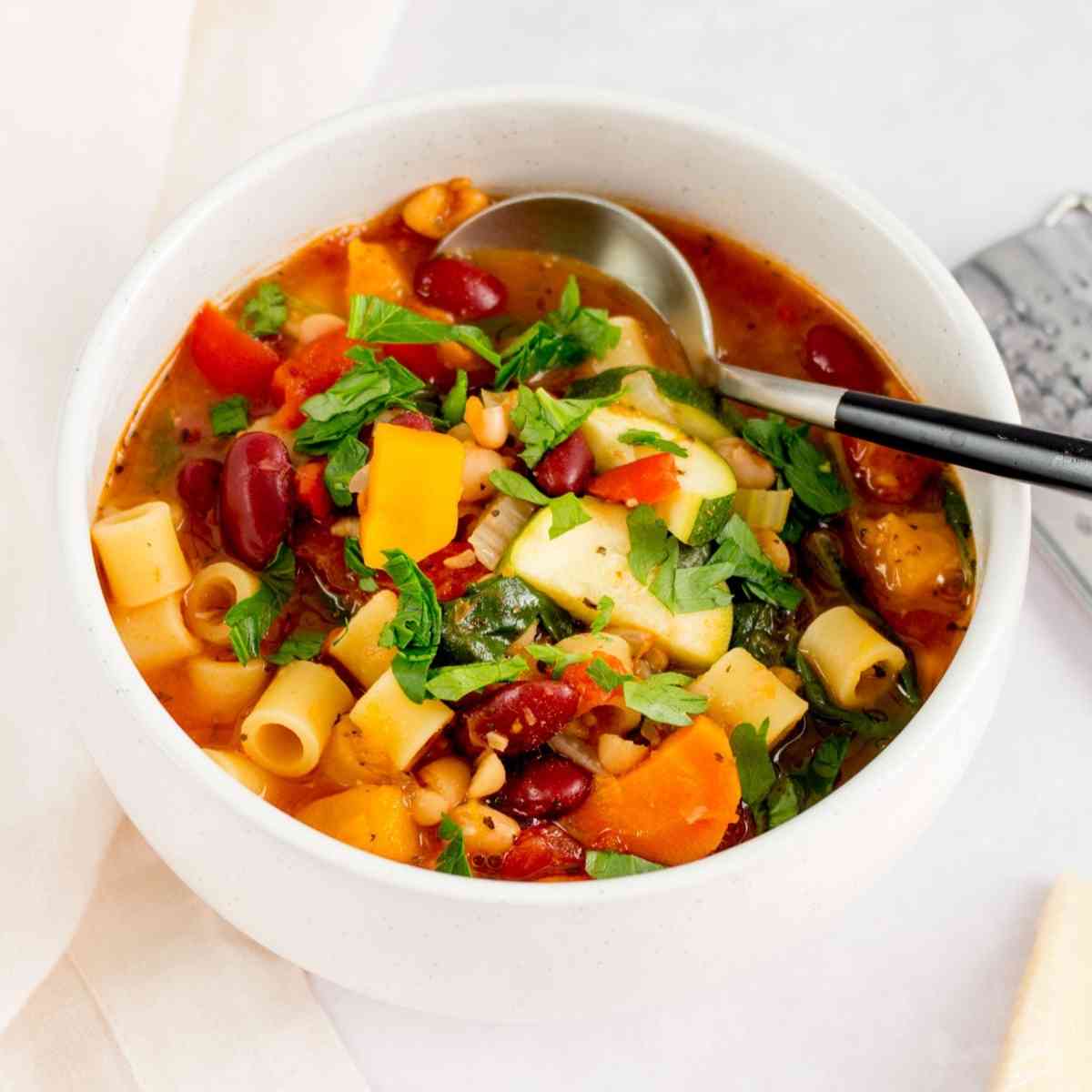 This easy Instant Pot Minestrone Soup can be on the table in less than an hour! Loaded with healthy veggies, fiber-filled beans, and tender pasta in a light and delicious tomato-based broth, top with grated parmesan and crushed red pepper for a cozy, comforting weeknight dinner.