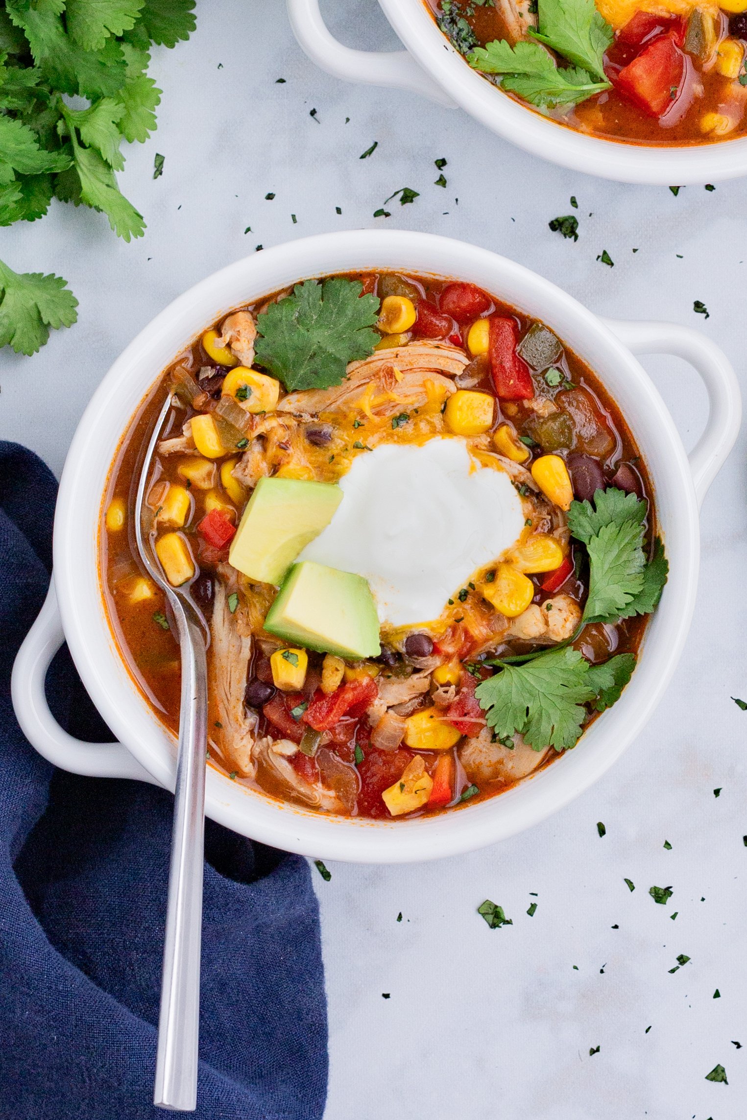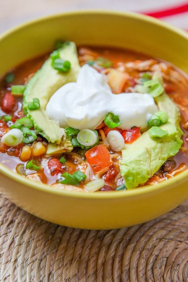 Enjoy the flavors of your favorite Mexican dish without all the work in this Chicken Enchilada Soup recipe! A can of enchilada sauce and taco seasoning mix combine with shredded chicken thighs, corn, tomatoes, and black beans for an easy meal the whole family will love.