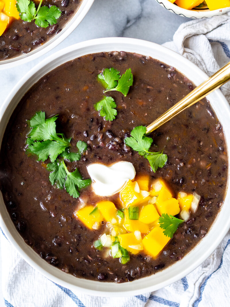 This instant pot black bean soup is smoky and spicy, perfect topped with a spoonful of fresh mango salsa and sour cream before serving!