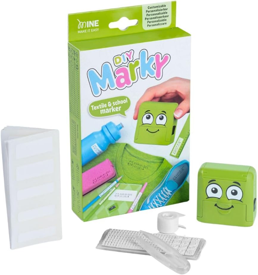 COLOP DIY MARKY Kids Customizable Stamps is An innovative, kid-safe, eco-friendly name-labeling kit that lets you quickly stamp (up to 1,000 clear impressions) or stick personalized IDs on clothes, water bottles, lunchboxes, and more—using washable ink, iron-on tape, and multi-surface labels.