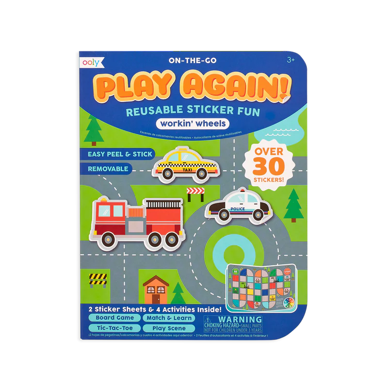 This play again! mini on-the-go activity kit comes with a board game, match and learns, tic tac toe, and a scene board to fill with colorful wheeled vehicle reusable stickers. It's perfect for keeping your little one entertained while you're on the go.