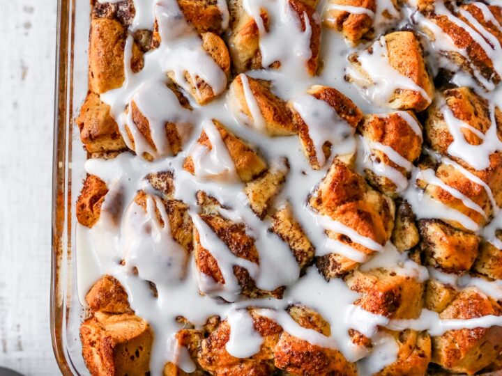 Cinnamon roll casserole tastes just like decadent cinnamon rolls, but without all the effort! This cinnamon roll casserole recipe is the ultimate brunch dish, made with Pillsbury refrigerated cinnamon rolls, eggs, milk, a touch of maple syrup, and a drizzle of icing over the top.