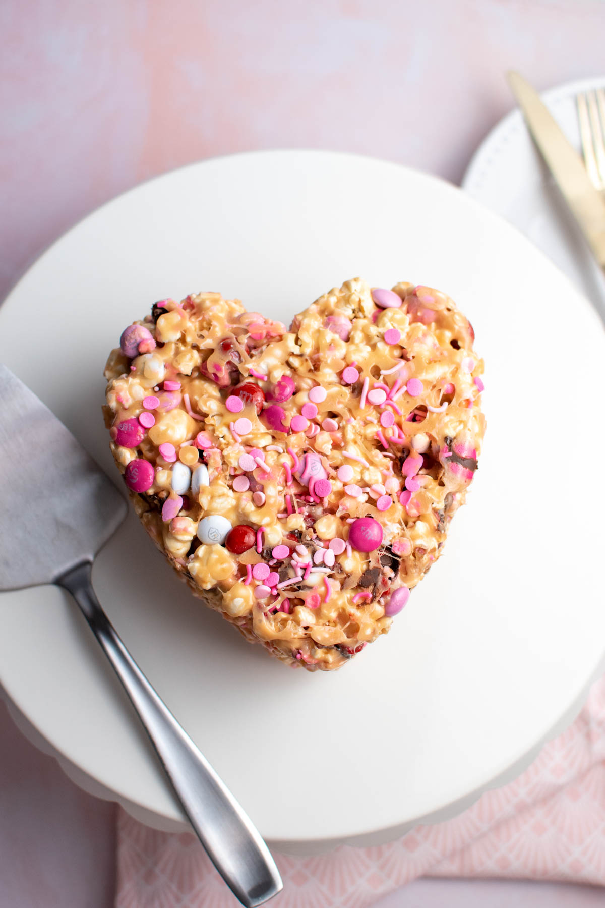 LIndulge in a festive and unique Valentine’s Day treat with this delicious Caramel Popcorn Cake. Packed with pink sprinkles and themed chocolate candies, it’s an excellent dessert to serve those you love!