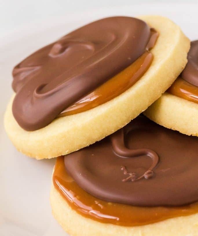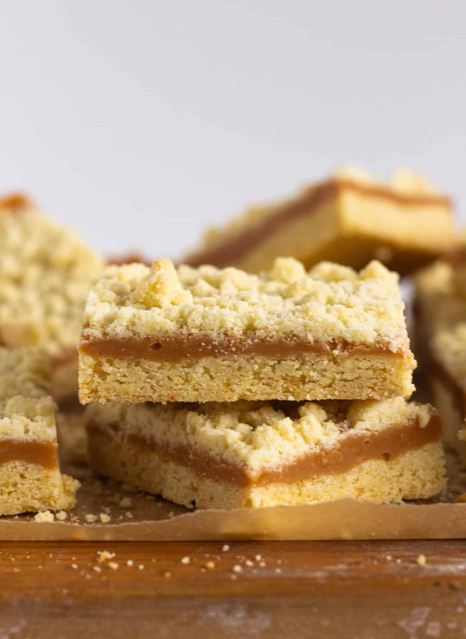 buttery, crumbly cookie base filled with rich and gooey caramel, topped