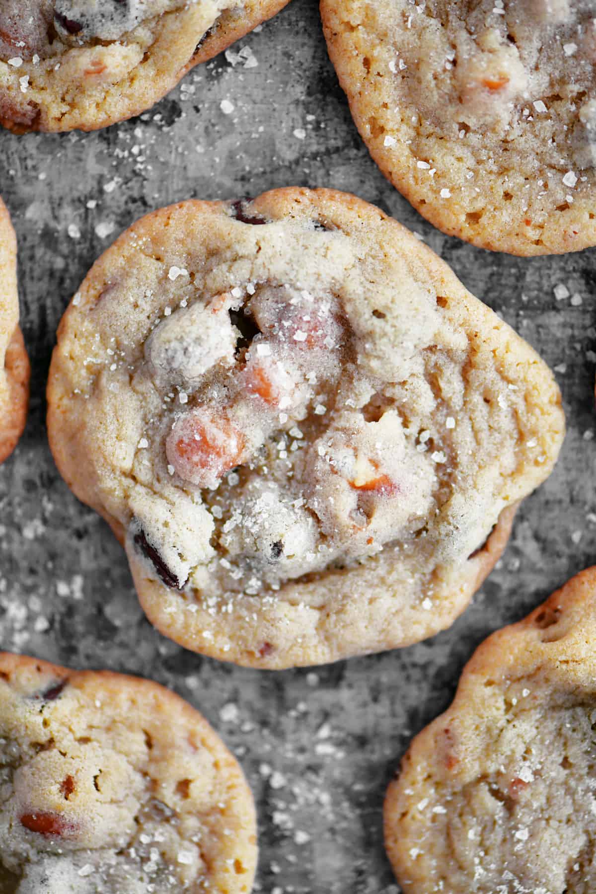 These salted caramel chocolate chip cookies have chewy caramel bits and crunchy pretzel pieces!