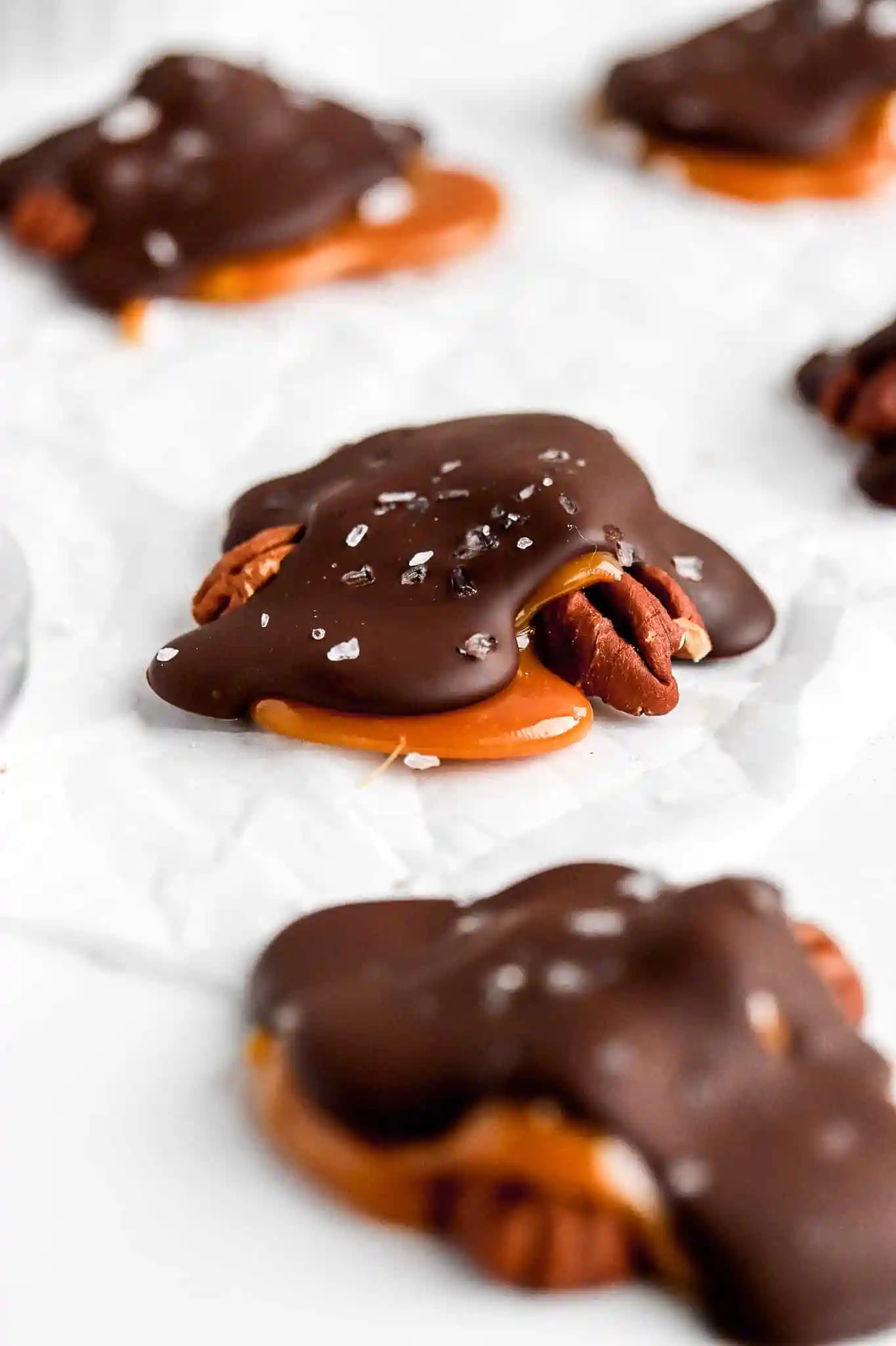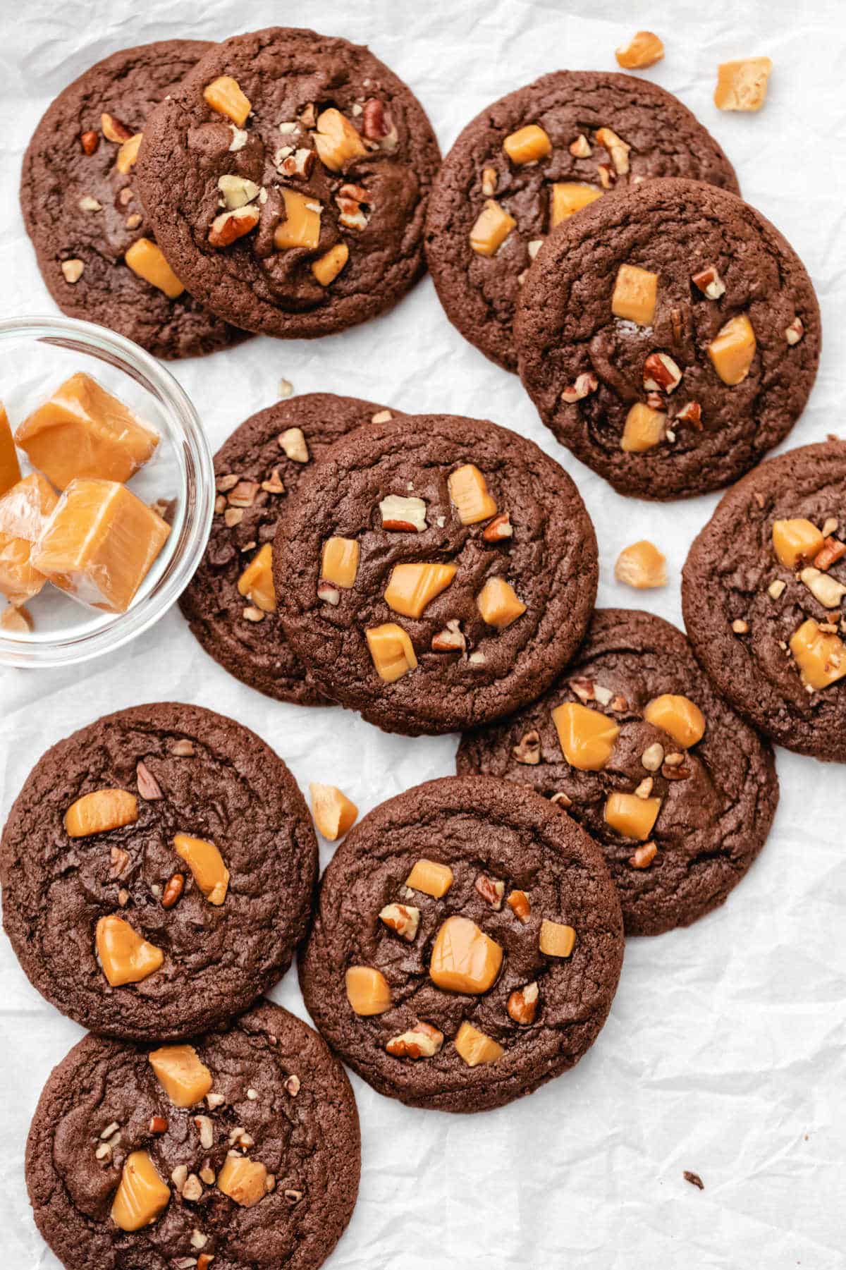 Turtle cookies are soft chocolate cookies packed with America's classic caramel bits and pecan pieces. These cookies are so easy and so tasty! Bake them on a parchment paper and store them at room temperature in an airtight container for up to 4 days.