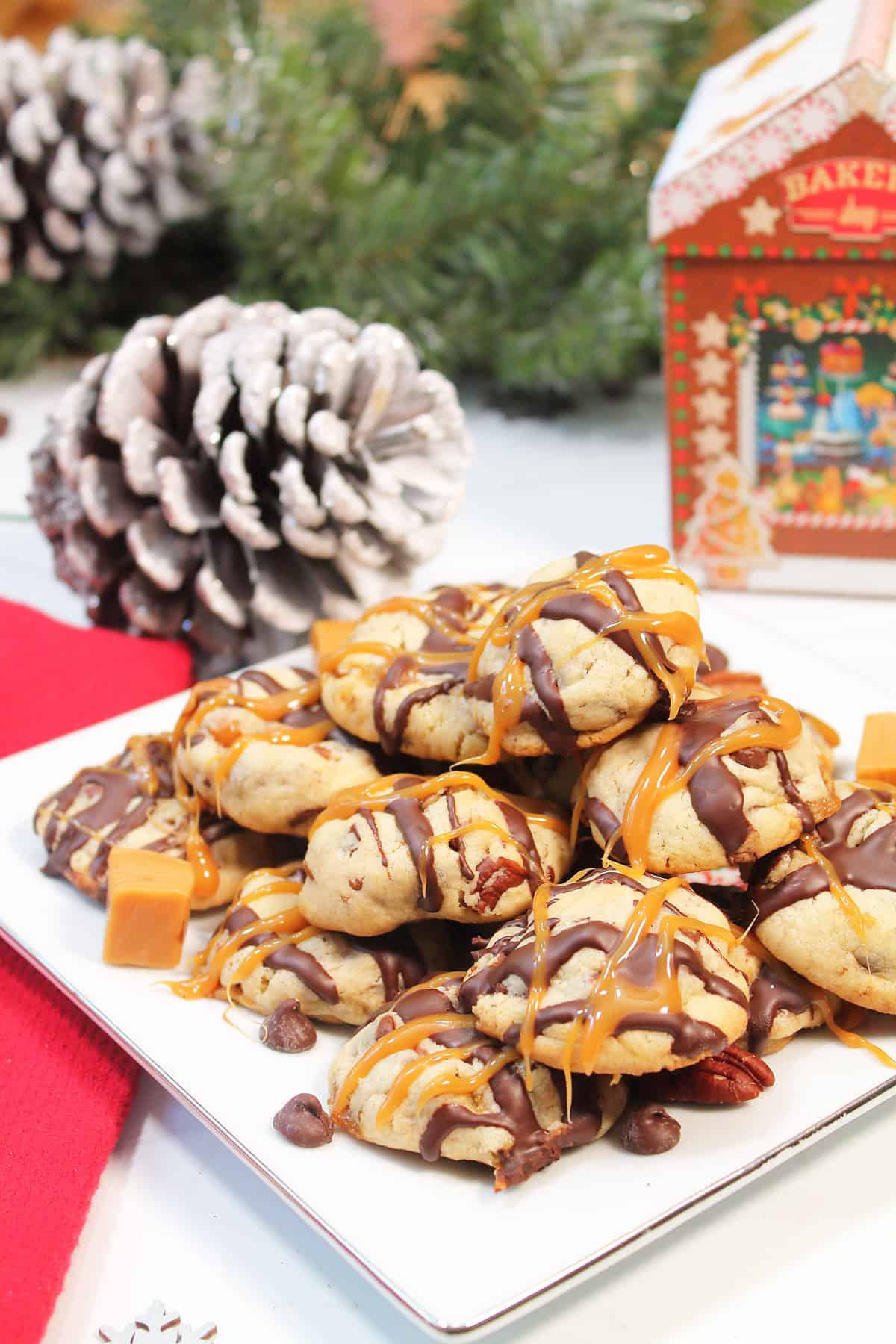 that are studded with caramel bits, chocolate chips, and crunchy pecans.